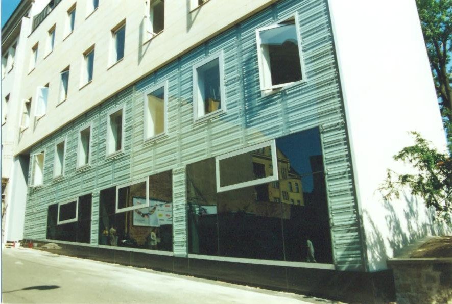 | uliční frontu tvoří skleněná zavěšená fasáda | |
